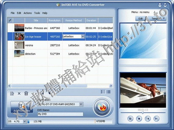 ImTOO AVI to DVD Converter是一套專門將AVI、MPEG、WMV、DivX轉換並且製作成DVD光碟